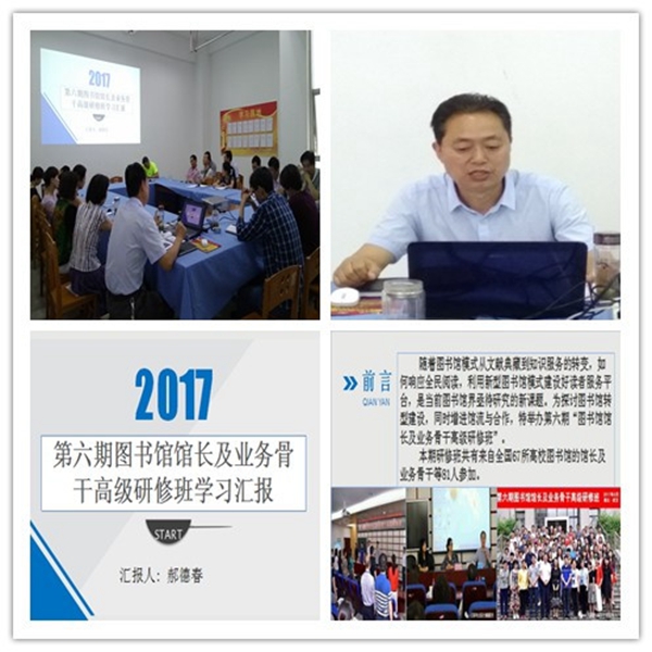 郝德春5月21日至26日参加了由武汉大学信息管理学院主办,人民邮电出版社、湖北三新文化传媒有限公司协办的“第六期图书馆馆长及业务骨干高级研修班”。郝德春从会议概况、会议内容和学习体会三个方面进行了汇报。会议郝德春详细介绍了本次研修班的专家团队,并以李工真教授的《德国工匠精神》、陆伟教授的《学术大数据的深度挖掘》、刘炜馆长的《未来图书馆简史》及肖希明教授《新信息环境下图书馆资源建设的变革与发展》等报告内容为例,讲述了新信息环境习图书馆资源建设的变革及策略,未来图书馆以数据和阅读推广为思路的发展方向,还结合我院图书馆实际情况畅谈了几点想法。通过参加研修班,一是开拓了视野,丰富了知识,有助于更好地开展和改进我院图书馆工作;二是结识了大批来自全国各地的图书馆同事,搭建了互相交流学习的平台,增进了图书馆和个人的友谊;三通过与业界大师的直接交流,掌握了国内图书馆界的第一手资料,刷新了图书馆在管理和服务方面的理念。李小玲说,现代化图书馆理念让我们非常受益,通过对比也暴露出我们的不足,在图书馆进一步建设、读者服务方面还任重而道远。希望大家在今后的工作中,要不断更新服务理念,提升业务能力,力争更好的为全院师生服务。