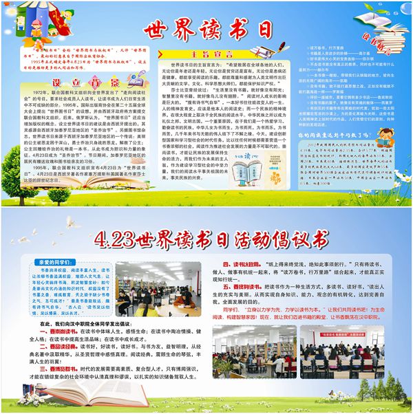 一是在学院图书楼前制作了“4.23世界读书日”宣传板,展示世界读书日的设立背景、主旨宣言,并发出倡议书,倡导师生要崇尚读书、要品读经典、要博览群书、要读书以致用、五要终身读书。