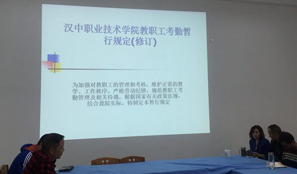 会上,图信中心综合办公室主任崔汉东带领大家重新学习了汉中职业技术学院管理规章制度,用PPT形式给大家详细解读了教职工聘任、考勤、值班等管理制度。