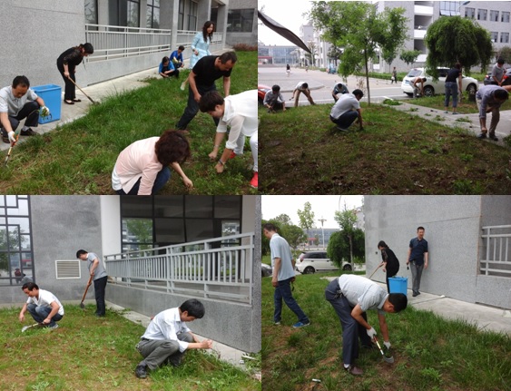 2015年6月1日上午,中心人员齐上阵,彻底清扫图书馆内外卫生环境。从一楼到四楼的楼面、走廊、楼梯,清洁区域责任到人,完成了室内卫生清扫工作。下午大家又按照学院分配的室外环境清洁区进行杂草清除、卫生清洁。